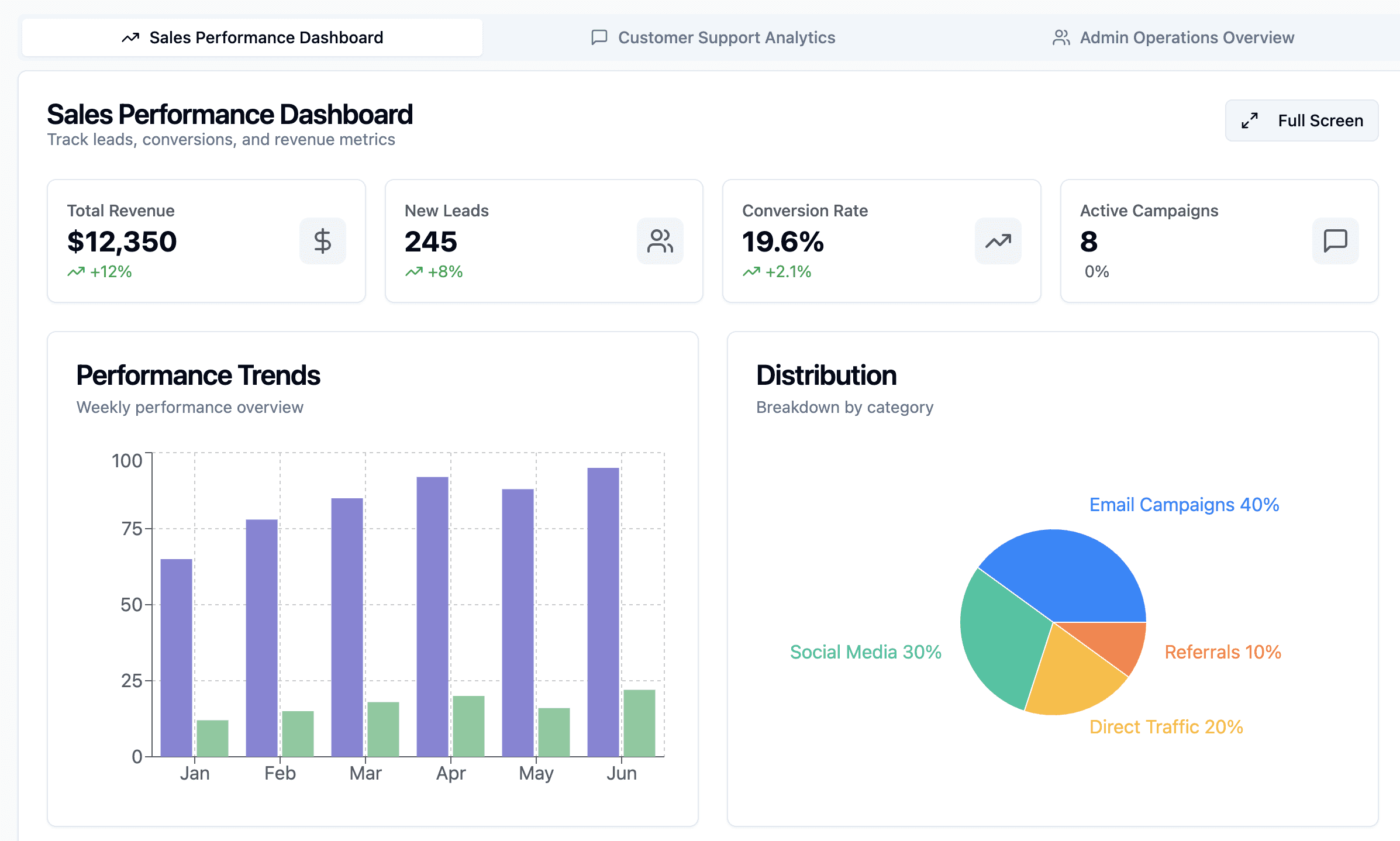 Dashboards are modular and can display: KPI metric cards Tables and log feeds Message histories Automation statuses or run logs Charts and visual reports Everything is read-only, so clients can view — not edit — your data.